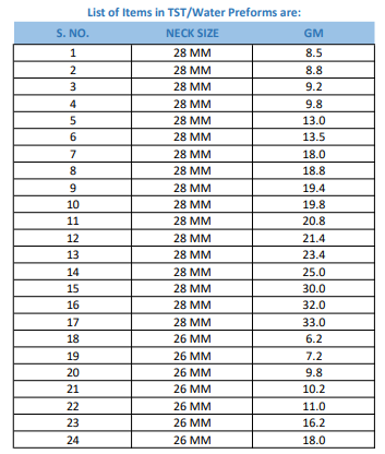 TST/Water Alaska or Three Start (TST) Preforms are commonly used to manufacture PET Bottles for packaged drinking water. List of Items in TST/Water Preforms are: NEED HELP CHOOSING THE RIGHT PACKAGING SOLUTION? Request A Quote Feel free to provide more details, and We’ll do our best to help! Submit Request